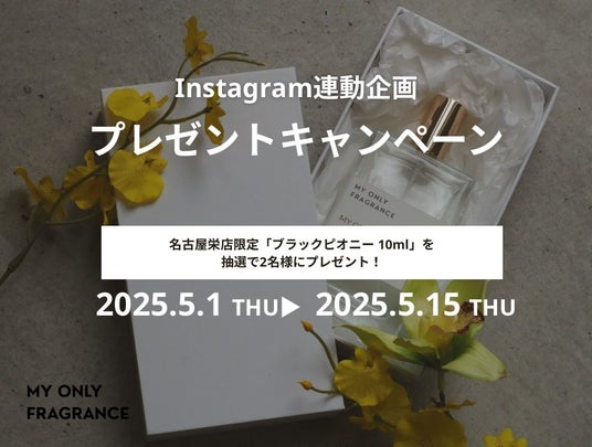 京都発のオーダーメイドフレグランス専門店「MY ONLY FRAGRANCE」を展開する株式会社フレグランスプロジェクト(本社:京都府京都市、代表取締役:和田慎平)は、「MY ONLY FRAGRANCE 名古屋栄店」のオープン2周年を記念して現在実施中の「復刻版特別ギフトボックスプレゼント」に続く第2弾企画として、2025年5月1日(木)~15日(木)までの15日間、Instagram連動キャンペーンを実施いたします。キャンペーン期間中、Instagramに所定の投稿をいただいた方の中から抽選で2名さまに、同店限定の香り「ブラックピオニー 10ml」をプレゼントいたします。