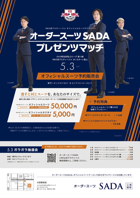 株式会社オーダースーツSADA(本社:東京都千代田区、代表取締役社長:佐田展隆)は、2025年5月3日(土)に『オーダースーツ SADA プレゼンツマッチ』にてオフィシャルスーツの予約会を開場~キックオフ(14:00)までNACK5スタジアム大宮Wエリア コンコースで開催いたします。オーダースーツSADAは、オフィシャルスーツサプライヤーとしてRB大宮アルディージャを応援しています!