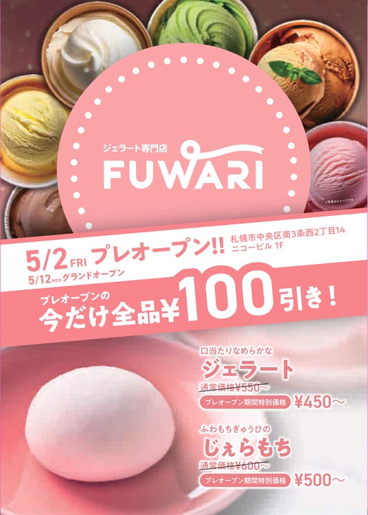 北海道を中心に、各種アミューズメントや宿泊・温浴施設、飲食店などを展開しているセイザンプランニング(本社:北海道札幌市中央区南3条西2丁目14ニコービル8階 代表取締役社長:晴山 徳貴)は、2025年5月12日(月)に札幌すすきのエリアでジェラート専門店 『FUWARI』(住所:北海道札幌市中央区南3条西2丁目14 ニコービル1階)をグランドオープンいたします。