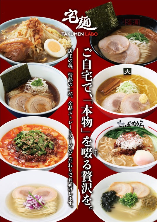 お店と同じスープ・麺・具材、各商品専用の作り方説明書で初めての方でも失敗せず、おいしく作れる「宅麺」で人気店のあの味をご自宅で楽しめます。