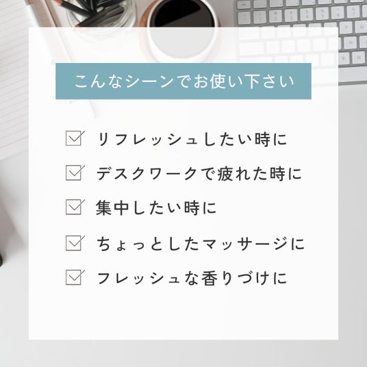 日常生活で頭が重く感じる時や思考がまとまりにくい時に、おでこやこめかみにくるくるとマッサージするだけで、爽やかな香りとともにすっと気分を切り替えることができるリフレッシュ用アイテムです。