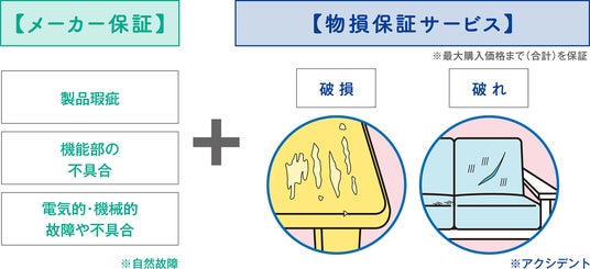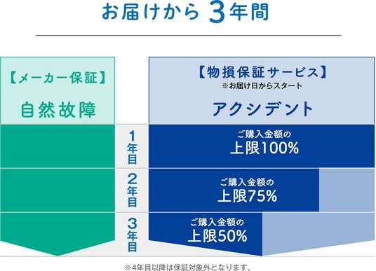 お買い上げいただいた製品の瑕疵や自然故障に対し、無償で修理対応を行う自社提供のサービス「3年保証」に加え、この度の物損保証サービスの導入により、小さなお子さまやペットのいらっしゃるご家庭で起こりがちな予期せぬアクシデントにも対応が可能となりました。
