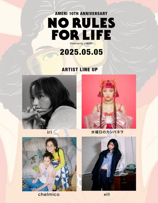 株式会社N2ホールディングス(兵庫県姫路市/代表取締役 山内俊一)は、B STONE株式会社(東京都港区/代表取締役 黒石奈央子)が運営するレディースブランド「Ameri(アメリ)」にて、ブランド初となる野外フェスイベント「Ameri 10th Anniversary "NO RULES FOR LIFE" Powered by J-WAVE」を5月5日(月・祝)に六本木ヒルズアリーナにて出店します。