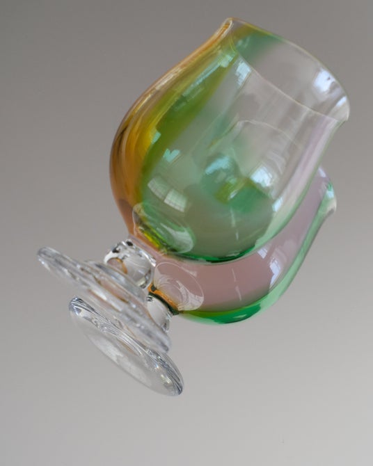 ガラス作家・神崎氏が手がける「SUIM GLASS」は、自然界の現象や空、海、光のゆらめきをモチーフに、溶けるようなフォルムと繊細な透明感を併せ持つアートピース。