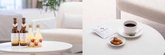 客室内にて群馬産フルーツジュース、クラフトビール、水ならびにザ・パティスリーのオリジナル焼き菓子をご提供。コーヒーも群馬発、ONCA COFFEEの白井屋オリジナルブレンドです。アートに囲まれた客室での贅沢な時間をお過ごしください。