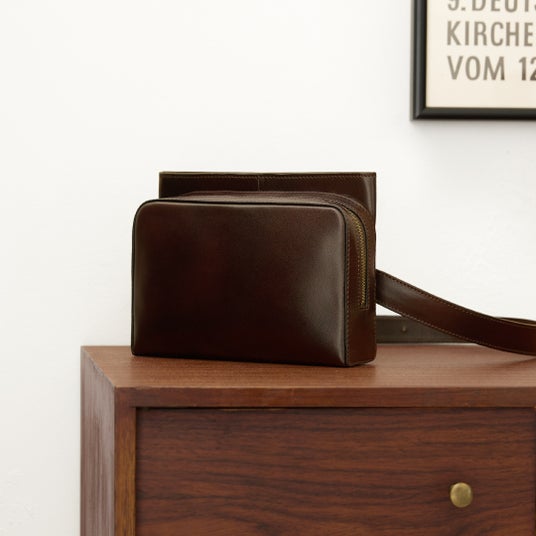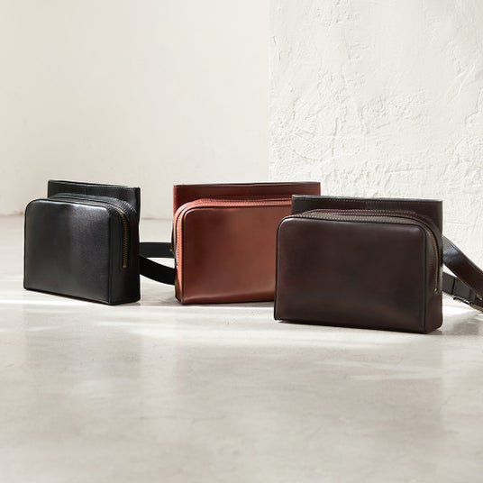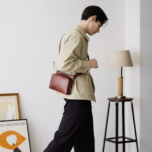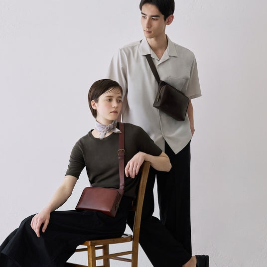 深みのある落ちついた色合いのレザーと、直線を基調としたフォルムは、カジュアルからきれいめまで、幅広いスタイリングにマッチします。