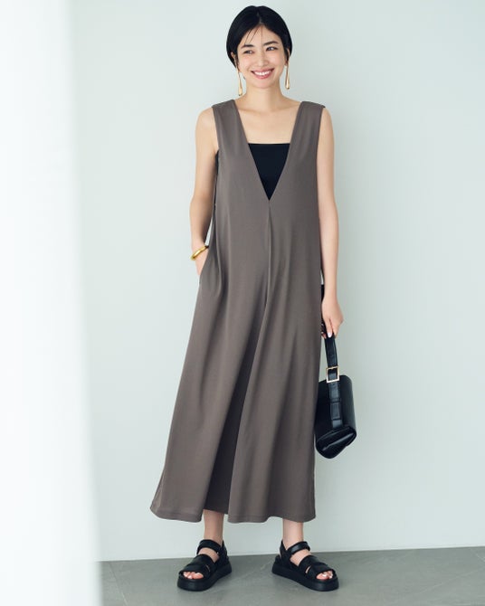 サマーイージーケアの機能性を存分に堪能できる夏にぴったりのサロペット。たっぷり生地を使ったワイドシルエット、首元は深めのVネックで、フェミニンで抜け感のあるデザインとなっています。素材に落ち感があるので、華奢見えも叶います。Tシャツ合わせでも着られます。