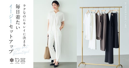 毎年大人気の「サマーイージーケアシリーズ」が新しいラインアップで今年も登場。快適な着心地と上品な見え感を兼ね備えたこのシリーズは、接触冷感・ストレッチ・イージーケア・マシンウォッシャブルの4つの機能を採用しました。これから訪れる夏を涼しく・ラクに過ごすことができると同時に、お手入れのしやすさにも目を向けた、忙しい大人女性の毎日にも寄り添う究極のノンストレス服となっています。