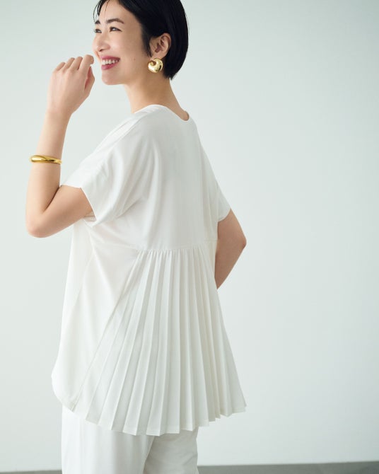 前から見るとシンプルなのに、後ろは動くたびに揺れる上品なプリーツデザイン。さりげないデザイン性が、着るだけで“きちんと感”を演出します。1枚で主役になる、大人の為のラクちんブラウスです。