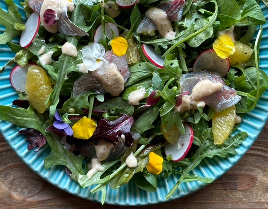 真鯵と芽生姜 甘夏のサラダほどよい脂とさっぱり感のバランスが良い春の真鯵を刺身に。甘夏の爽やかさ、ルッコラセルバチカの力強い香り、芽生姜のさわやかな辛みとともにサラダ仕立てに。味噌 × オイル × ビネガーの自家製ドレッシングが、素材の旨みを引き立てながら、まるで “なめろう” のようなコク深さを生み出します。ほんのり香るごまの風味と可憐な花のトッピングが、春らしい華やぎを添える一皿です。