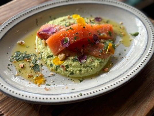 桜マス そら豆のフムス脂の乗った桜マスは魚本来の旨みやしっとり感をしっかり感じていただくために厚切りに。そら豆ペーストに練りごまとレモン汁を加えた自家製フムスを添え、春らしい彩り豊かに仕上げました。香ばしいアーモンドが食感のアクセント。ハーブとオリーブオイルが桜マスの旨みを引き立てる、シンプルで爽やかな前菜です。