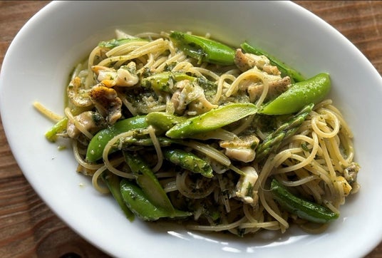 つぶ貝と春野菜のジェノベーゼスパゲッティ身がぷりっとして、弾力が増したつぶ貝と、みずみずしいアスパラガス、スナップエンドウを合わせた春の彩りが詰まったパスタ。ジェノベーゼソースには、爽やかな苦味と香りが特徴の春菊を使用。貝の旨みと春野菜の甘みを引き立て、まさに芽吹きの季節を思わせる “若草色の春“ を感じるひと皿です。