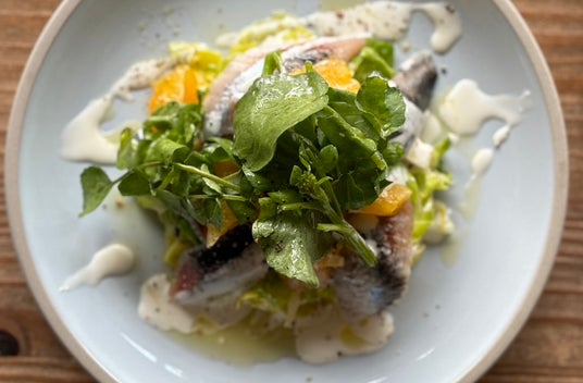 真鯵 春キャベツの浅漬けとオレンジのマリネ春に旬を迎える、ふっくらと厚みを増した真鯵と甘みのある春キャベツを、クミンなどのスパイスがほんのり香る浅漬け風に。上にあしらったクレソンのほろ苦さが全体を引き締めます。爽やかさとパンチを兼ね備えた仕上げのヨーグルト×にんにくのソースが、食欲を一層かき立てます。