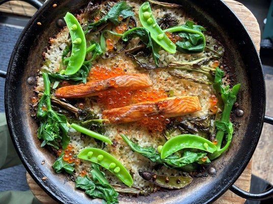 桜マスと春野菜 イクラのパエリア脂がしっかりと乗りつつ、くどさのない、春の桜マスを贅沢に使用した、季節感あふれるパエリア。鮭の炊き込みご飯にいくらを添えた、和の要素を感じる、優しい味わいです。パエリアのおこげと、ほぐした桜マスの脂が溶け合い、深みのあるコクを感じる一皿に。春野菜はその日の仕入れで変わるため、訪れるたびに新しい味わいに出会えます。
