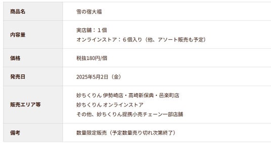 三幸製菓株式会社(本社:新潟市北区、以下三幸製菓)が販売するロングセラー「雪の宿」の味わいをイメージした「雪の宿大福」が、三幸製菓グループの有限会社Runeが展開する和菓子店・妙ちくりん(本社:群馬県伊勢崎市、以下妙ちくりん)の各店舗およびオンラインショップで2025年5月2日(金)より数量限定で発売されます。