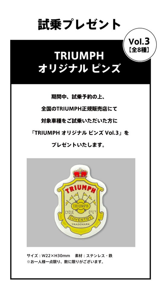 期間中、対象モデルの試乗予約をし、全国のTRIUMPH正規販売店にてご試乗された方に、「TRIUMPH オリジナル ピンズ Vol.3」をプレゼントいたします。