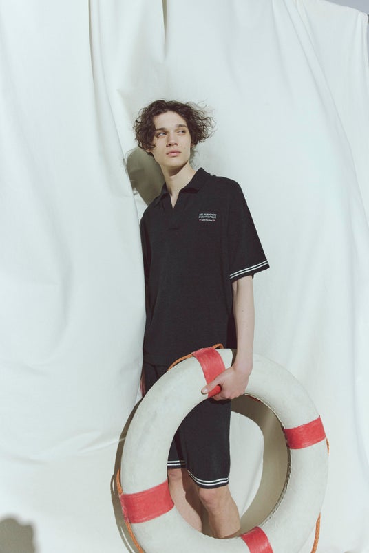 ニットシャツの袖には立体的なワッフル編みを施し、マリンカラーのアップリケとラインデザイン、ロゴ入りのボタンでアクセントを添えました。プルオーバーは「航海に出る、出発する」というメッセージと、マリンテイストなラインデザインをジャガードで表現しました。