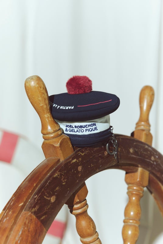 ファスナーをぐるっと開ければ、中にちょっとしたコスメや小物などを収納できます。頭頂部の赤いポンポンの周りには、「航海に出る、出発する」という意味のロゴ刺繍入り。夏の気分が盛り上がるキャッチーなアイテムは、同シリーズのルームウェアとセットにして大切な方へのギフトとしてもおすすめです。