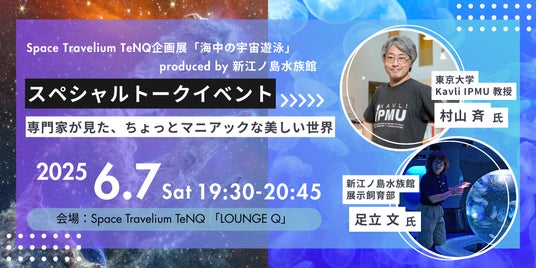 東京ドームシティ(文京区後楽1-3-61)の黄色いビル(6F)にある宇宙体感施設「Space Travelium TeNQ(スペーストラベリウムテンキュー)」では、2025年6月7日(土)に、館内で開催する『Space Travelium TeNQ企画展「海中の宇宙遊泳」produced by 新江ノ島水族館』を記念したスペシャルトークイベントを開催します。