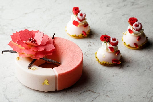 芳醇な香りを纏うジャスミンティーのクレームブリュレに、ほのかな苦味がアクセントのブラッドオレンジのクーリとビターチョコレートのビスキュイを重ね、ピンクグレープフルーツムースで優しく包み込みました。華やかな香りと調和する繊細な味わいは母の日にふさわしく、日頃の感謝を表現したペストリーシェフ ハフィズ・ラザリの逸品です。心を込めたデコレーションとともに、特別なひとときを演出します。