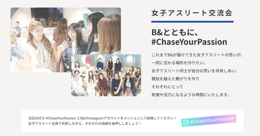 これまでB&が届けてきた女子アスリートの思いが、一同に交わる場所を作りたい。女子アスリート同士が自分の思いを共有しあい、競技を越えた繋がりを作りそれぞれにとって刺激や活力になるような時間をお届けします。