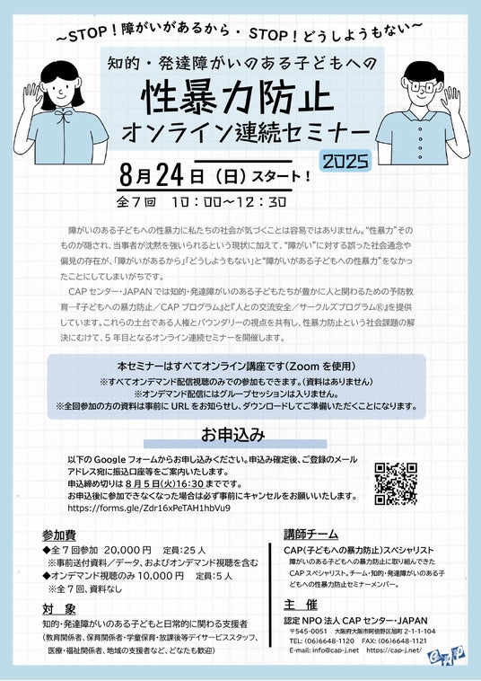 CAPセンター・JAPANでは知的・発達障がいのある子どもたちが豊かに人と関わるための予防教育―『子どもへの暴力防止/CAPプログラム』と『人との交流安全/サークルズプログラム(R)』を提供しています。これらの土台である人権とバウンダリーの視点を共有し、性暴力防止という社会課題の解決にむけて、5年目となるオンライン連続セミナーを開催します。