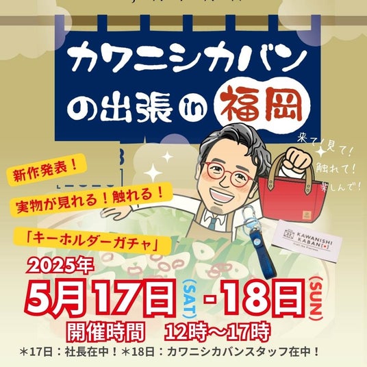 「 愛されるものづくり」をビジョンに掲げる香川県のカバンメーカー、株式会社カワニシカバンプロダクト(本社:高松市太田上町、代表取締役社長:川西功志)は、FFB(福岡ファッションビル)1階5号ホールで、カワニシカバンのファンへ向けたイベント「カワニシカバンの出張in福岡」を2025年5月17(土) -18(日)に開催いたします。