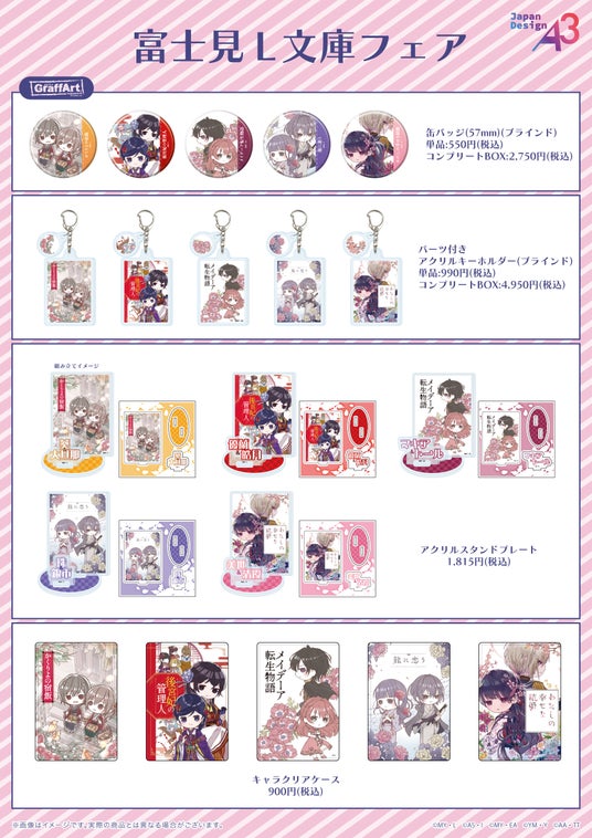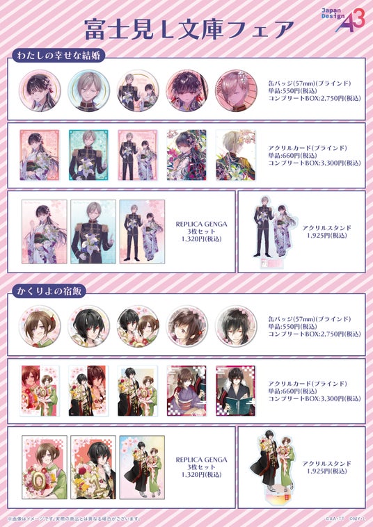 新作グッズは『わたしの幸せな結婚』『かくりよの宿飯』の描き下ろしイラストのほか、公式イラスト、A3オリジナルイラスト・GraffArt(グラフアート)を使用したファン必見のものばかりです。