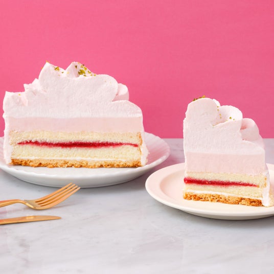ハート型にカットした苺とピンク色の生クリームが可愛らしく華やかなケーキです。