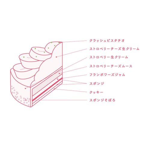 北海道産のいちごを丁寧に裏ごししたピューレに、北海道産のクリームチーズとマスカルポーネチーズ、生クリームを絶妙な配合でブレンド。上品かつ濃厚なチーズムースとミルク感溢れるマスカルポーネチーズ生クリームに仕上げました。