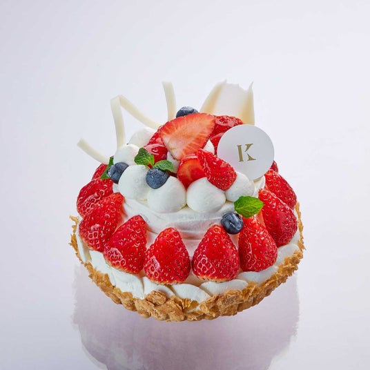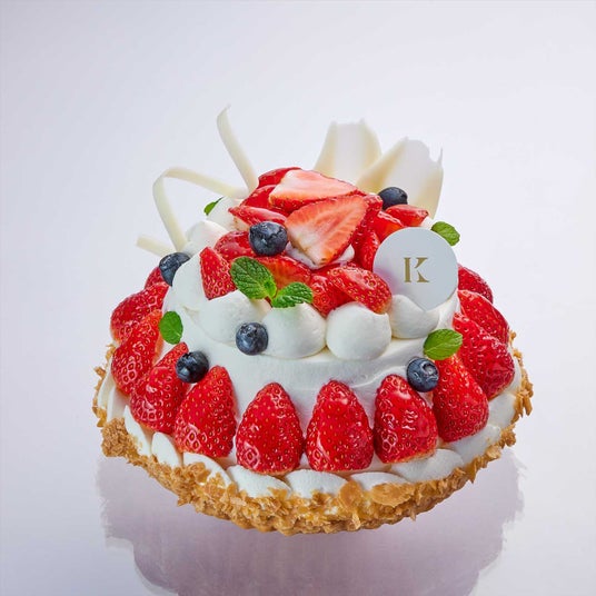 香ばしいサクサクパイにのせて、真っ赤な苺とブルーベリー、生クリーム、ホワイトチョコレートで飾り付けた、お誕生日や記念日などのお祝いを華やかに彩るデコレーションケーキ。