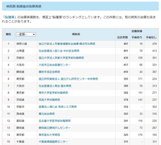 また特定の病院がどの治療・手術をどの程度行っているか、さらにそれが全国・県内で何位か、といった詳細情報まで確認が可能。
