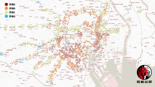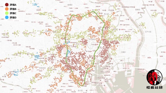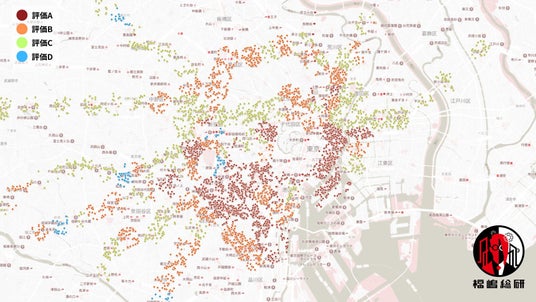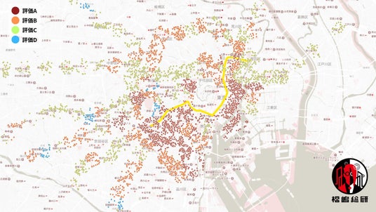 また図1では、これらの評価結果を地図上にプロットし、各駅周辺の評価を以下の通りに色分けしています。