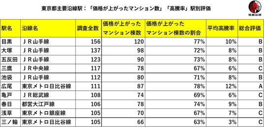 表1:東京都主要沿線駅:「価格が上がったマンション数」「高騰率」駅別評価