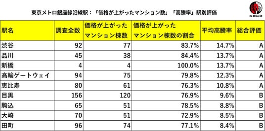 表2:東京メトロ銀座線沿線駅:「価格が上がったマンション数」「高騰率」駅別評価