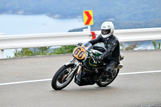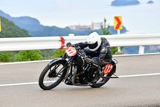 普段公道を走行できない歴史あるクラシックバイクや様々なスペシャルバイクが公道(伊勢志摩スカイライン)を走行