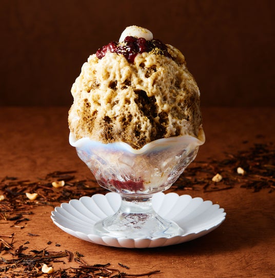 大和金時良にふさわしいかき氷を追求し、大和茶、みむろ杉の甘酒と榛(ヘーゼルナッツ)の2種のシロップで仕上げます。トッピングには西善のあずきと自家製の白玉をあしらい、奈良を代表するかき氷が完成しました。