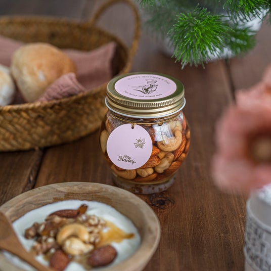 ハンガリー産の希少な”生”アカシアはちみつに、アーモンド・くるみ・カシューナッツ・マカダミアナッツを漬け込んだ贅沢な一品。