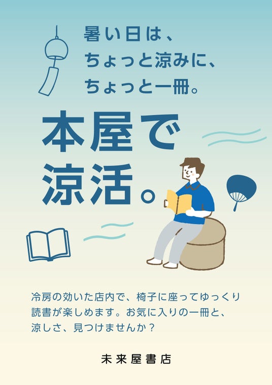 未来屋書店では、冷房の効いた心地よい空間を提供する「本屋で涼活」を通じて、本屋を単なる「買い物の場」ではなく、涼みながら心を整え、地域の人々が集える“居場所”として再定義します。