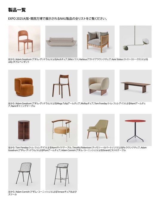 「Billo」「Molloy」「Mega Tulip」「Plum」「Harbour」などのコレクションを手がけたAdam Goodrum(アダム・グッ ドラム)は、次のように語っています。「大阪で開催される2025年の万博で、自身のデザインが展示されることを大変光栄に思います。NAUの家具が、来場者の体験をより豊かにし、オーストラリアパビリオンに活気と温かみのある雰囲気をもたらす存在になることを嬉しく思います。この万博は、オーストラリアデザインのストーリーを世界と共有する貴重な機会です。」