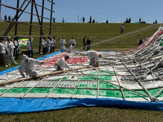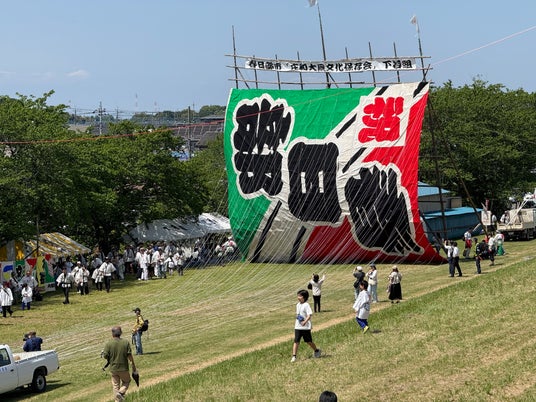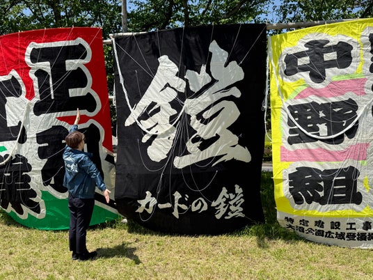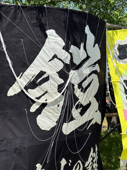 人より大きい高さ3.1m「鎧」文字の凧