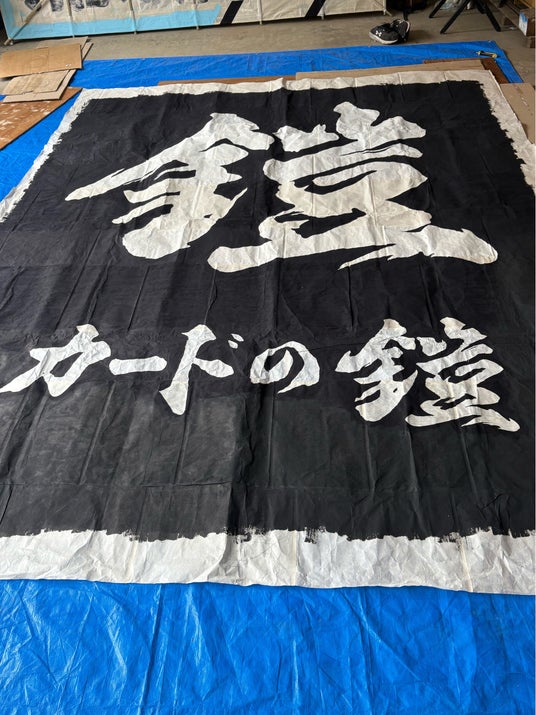 大型和紙に凧絵を手描きで制作している様子