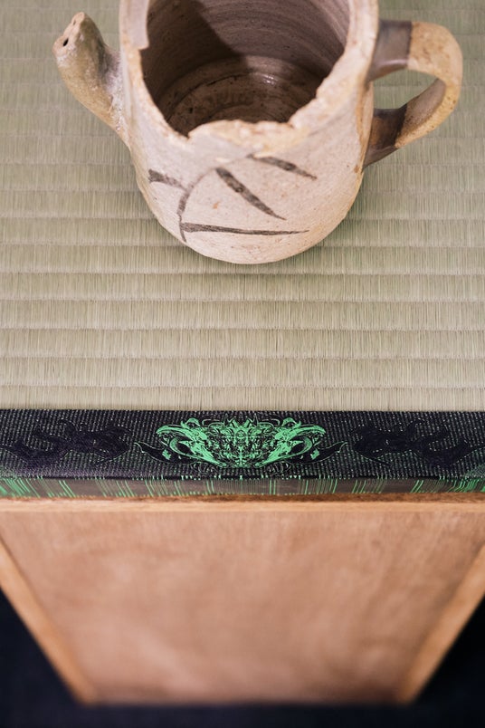 畳縁には、中西が本展のために特別に制作した図案を使用。キャンバス地に高精細UVプリントを施すことで、繊細なテクスチャーまで表現されています。このプリント技術は中西の絵画制作でも活用されており、密度のある描写と畳の伝統的な素材感が重なり合うことで、光の加減や視点によって表情が変化する視覚体験を提供します。