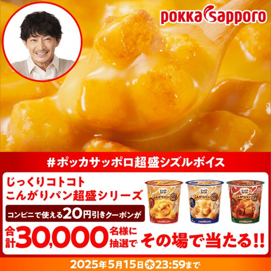 第二弾は2025年5月6日(火)から5月15日(木)の期間中、「#ポッカサッポロ超盛シズルグランプリ」で選ばれたレビュー10選を津田健次郎さんが読み、音声コンテンツ化したものをポッカサッポロ公式Xにて10日連続で投稿します。対象の投稿をリポストすると、コンビニエンスストアで使える「じっくりコトコトこんがりパン 超盛」シリーズの20円引きクーポンが抽選で合計30,000名様に当たります。