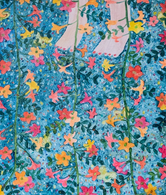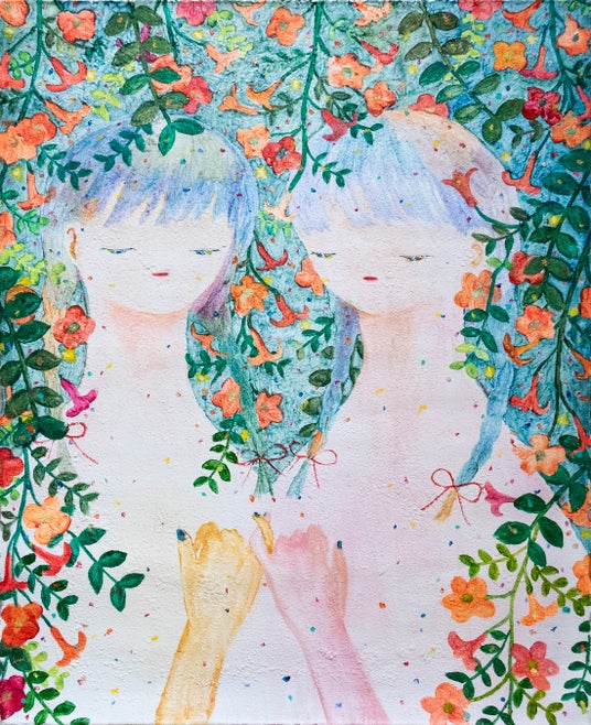 神話も暴力もない「もうひとつの王国」では、少女や草木と動物たちが溶け合うような調和で平等に存在するようすが、和紙やドイツの新聞紙などに油彩で描かれ、こちら側の世界を静かに見つめている。