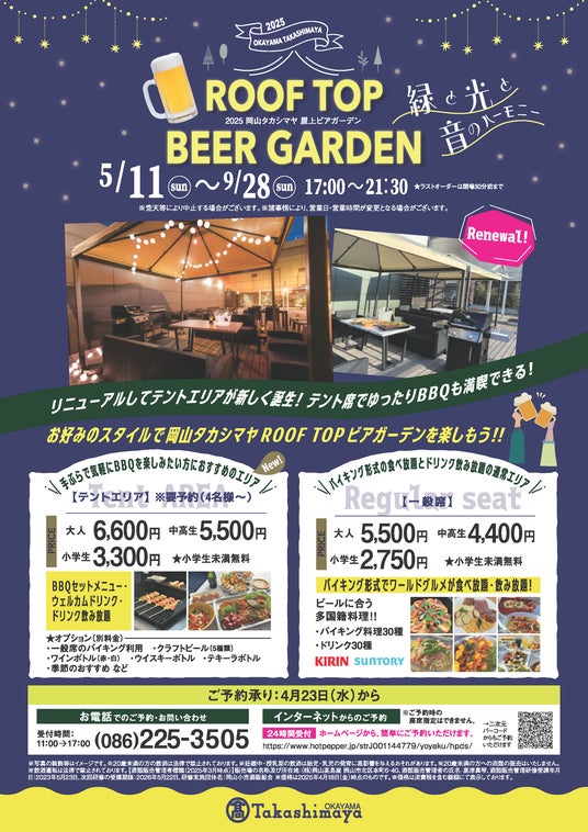 サルボ両備株式会社(本社:岡山県岡山市北区錦町、社長:松田敏之)が運営する、岡山高島屋(所在地:岡山県岡山市北区本町)屋上ビアガーデンが、2025年5月11日(日)からスタートします。2017年以来8年ぶりのフルリニューアルとなります。初日は母の日ということもあり、女性のお客様先着30名様にプレゼントをご用意しています。