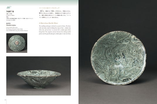 《青磁練上 碗》のマーブリングは一体どうやって出来上がったのか、見れば見るほど謎が深まりますが、青磁土と白土、赫土の三色土を練り上げてつくられています。このような混ざり合いがぴたりと一つの器になる技術に驚愕します。本書の作品は様々な技法を駆使してつくられていますが、巻末には「青磁を視る、知る-色と装飾」で、色のしくみ、青磁の色合い、技法紹介をしていますので、複雑で高度な技術の上に成り立つことがわかります。技法を学び見直すと、さらに魅力が深まるでしょう。