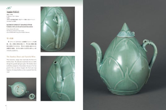 まさに筍のかたちをした酒器です。筍の枝や皮の葉脈までが繊細に表現され、青磁の釉色と相まって、本物の筍でつくられているかのようです。見た目も楽しく、清々しい香りが漂ってきそうです。その他にも思わず笑みが浮かぶような、ユーモラスな青磁も掲載されています。