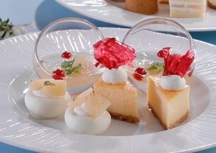【メニュー】(上段)桃のジュレ / ベイクドチーズケーキ / パブロバ