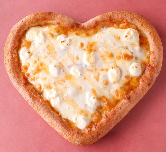 イタリア産モッツァレラ、北アルプスあづみ野地方で作られたクリームチーズ、カマンベールを使用したとろけるチーズなど、こだわりのチーズたっぷりの真っ白なハートピザ。